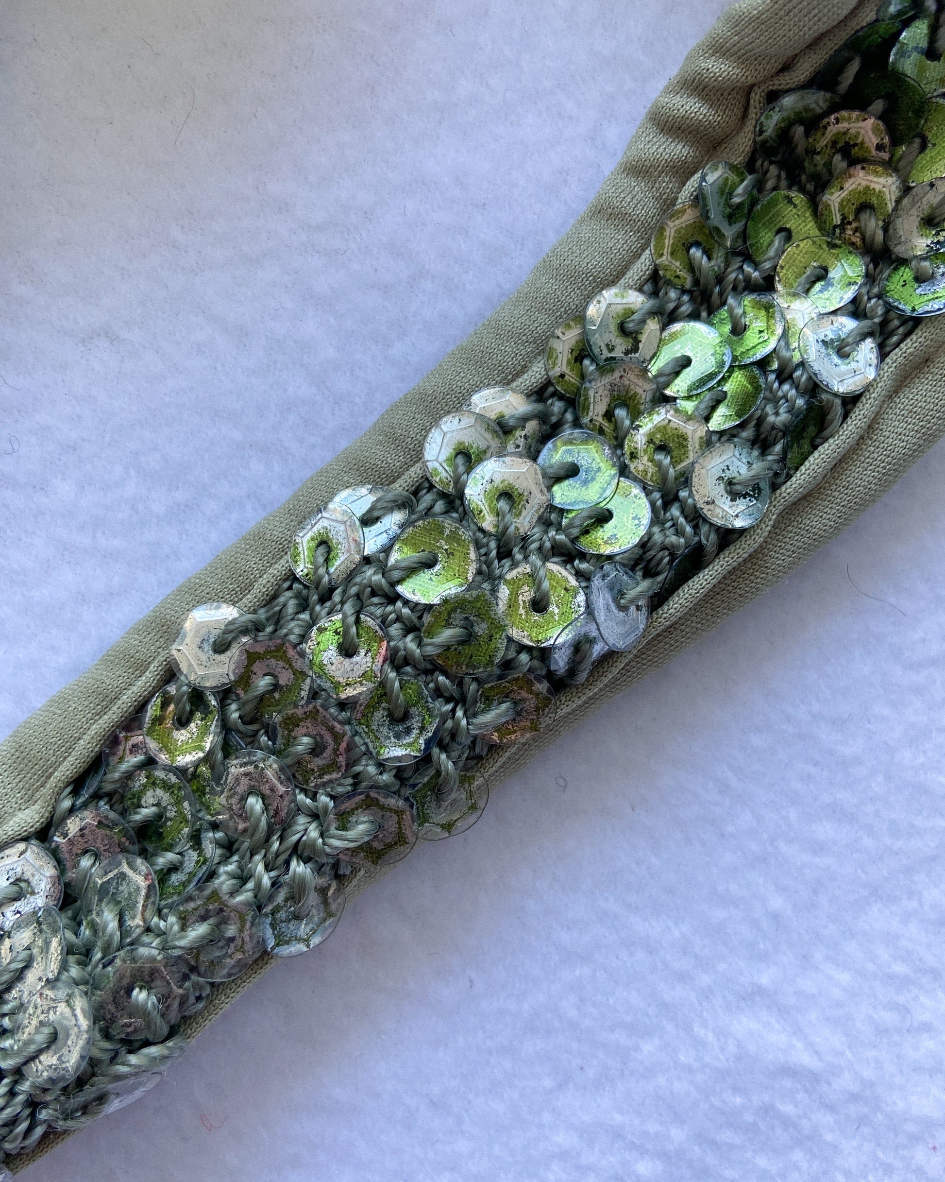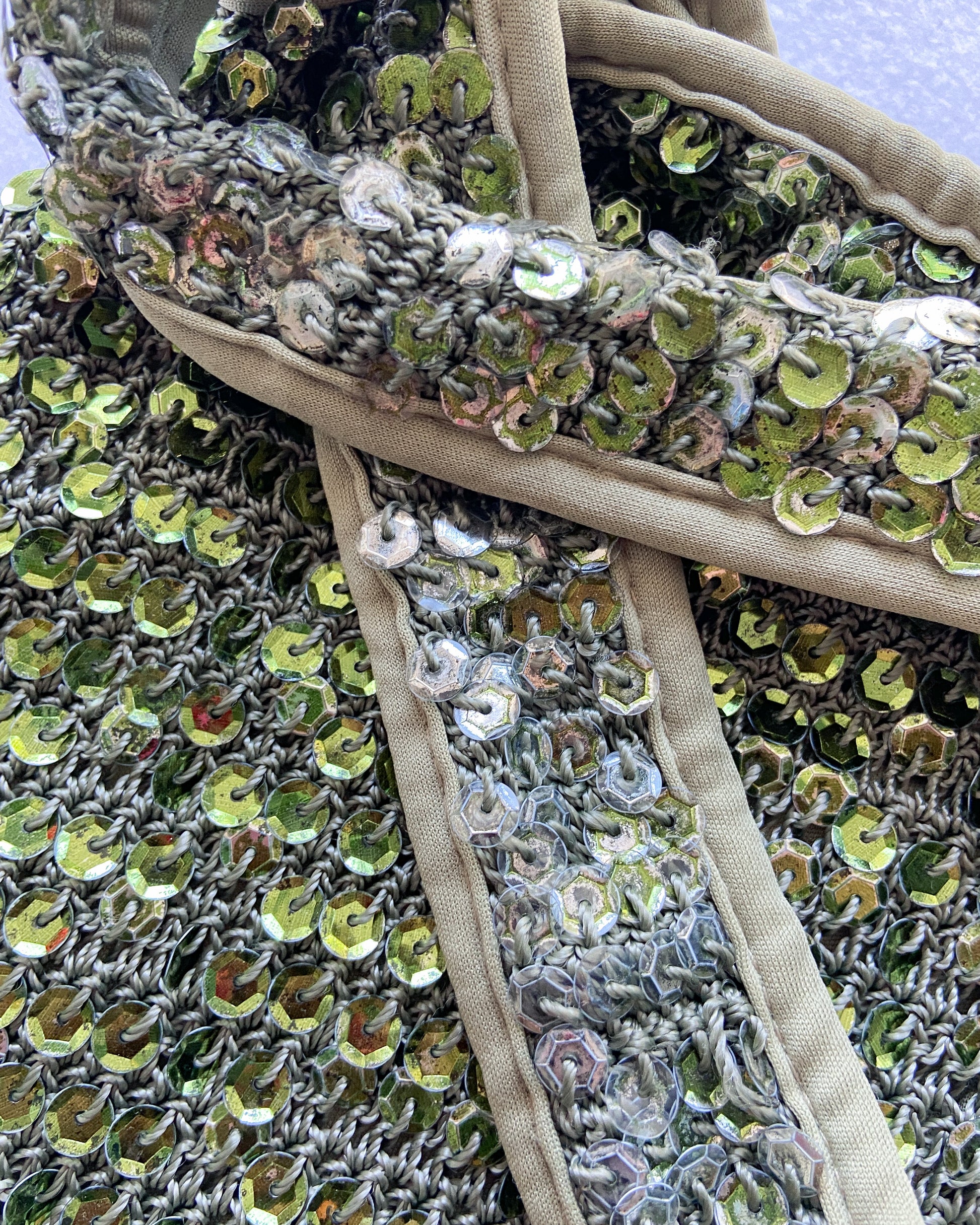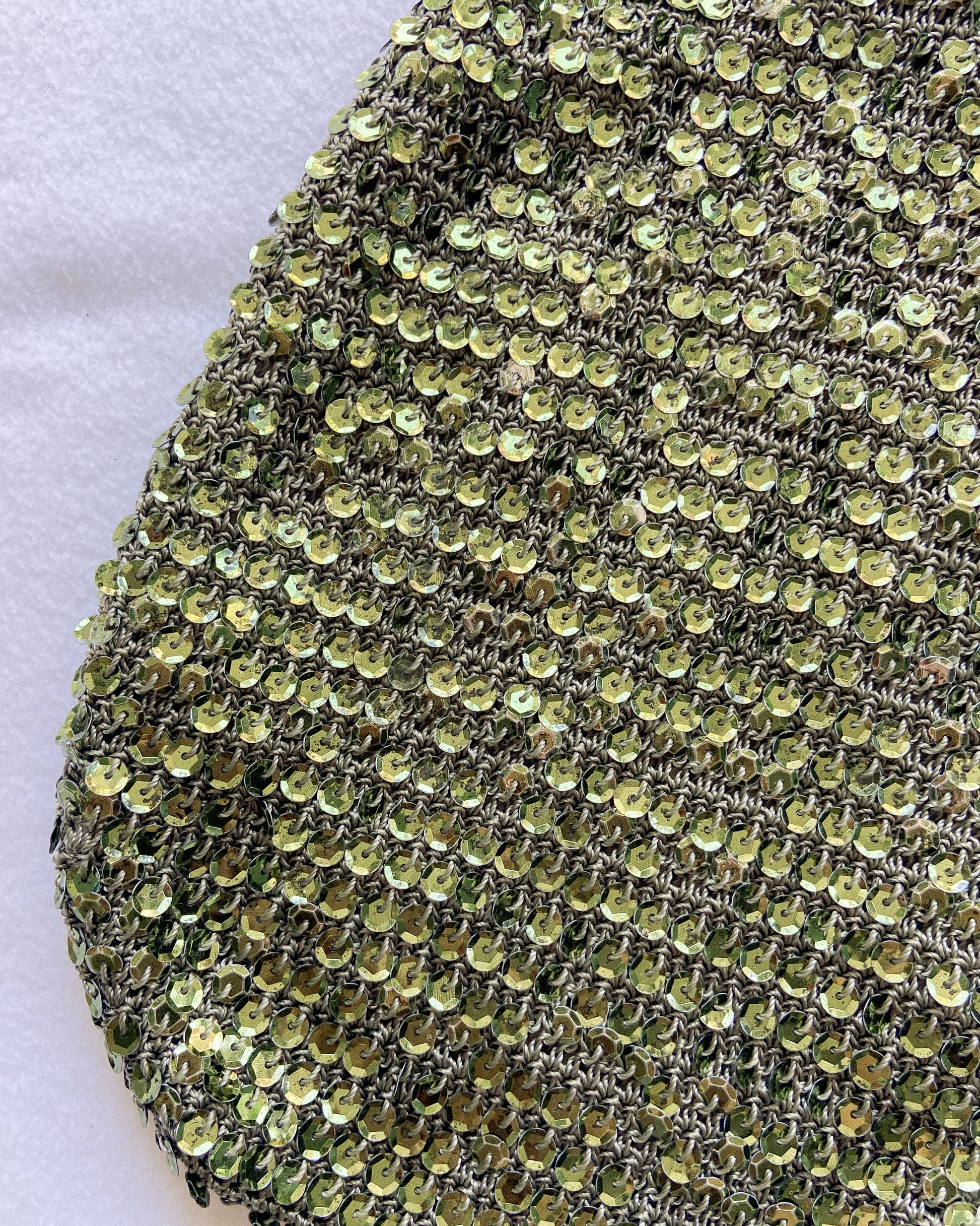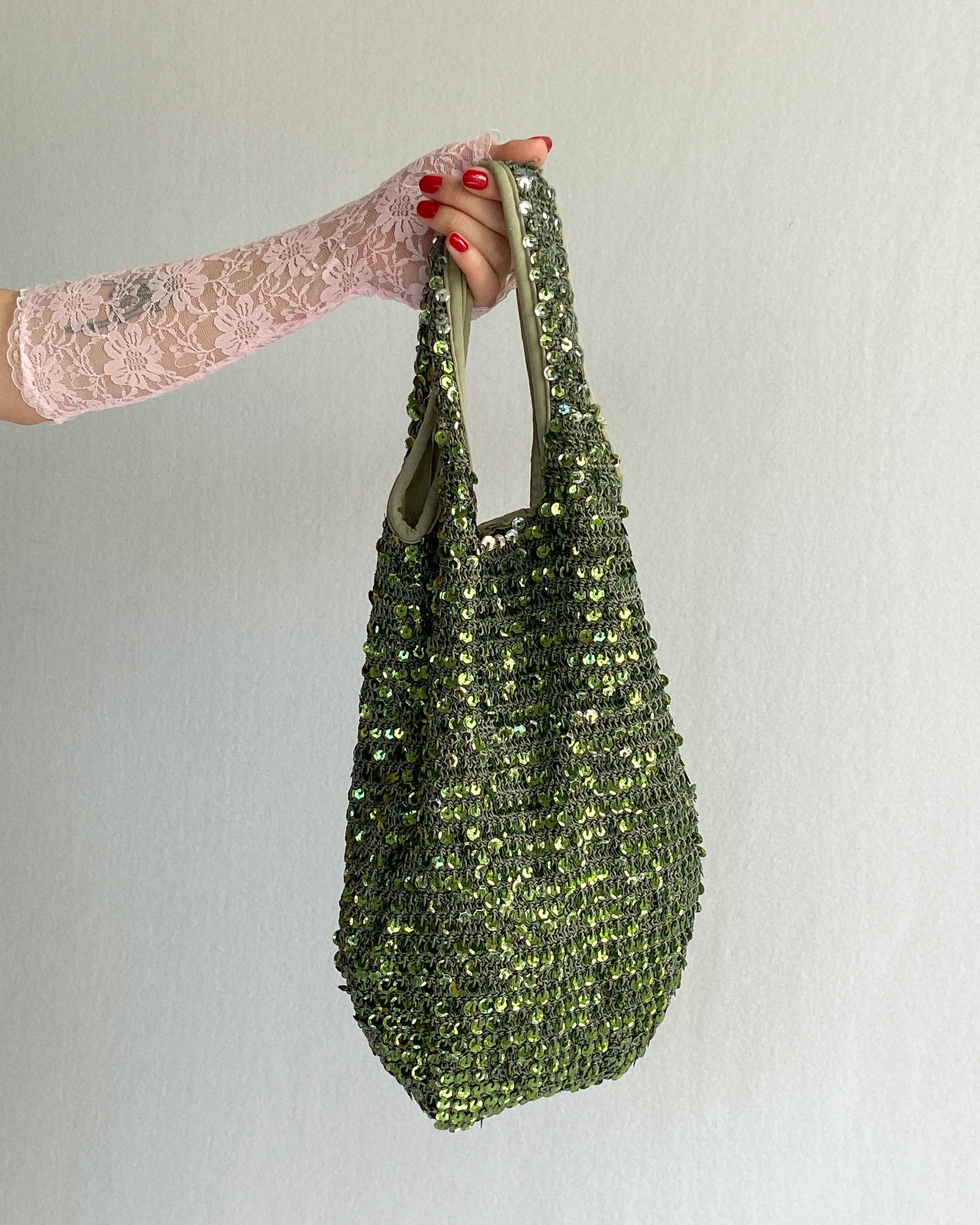Condition: 7/10 the sequins on the handle have lost their green colour, one small pull by the button inside the bag.